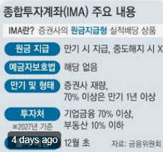 종합투자계좌(IMA)는 증권사가 원금을 보장하면서 운용하는 실적배당형 금융상품입니다. 투자자는 예·적금처럼 수시 해지가 아닌 일정 기간 동안 투자해야 하며, 개별 상품 포트폴리오를 직접 확인 후 가입할 수 있습니다.